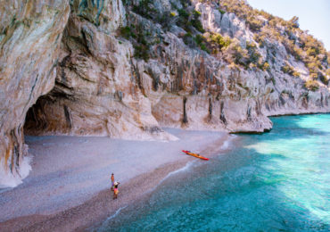 Cala,Luna,Sardinia,,Young,Couple,With,Kayak,Boat,On,The